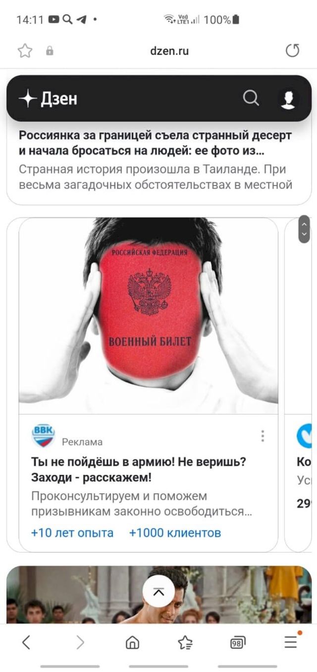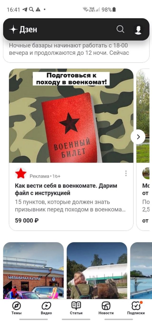 «Просим квалифицировать и рассмотреть на предмет нарушения (Федеральные законы от 04.03.2022 № 31-ФЗ, № 32-ФЗ) «О дискредитации ВС РФ» публикации «Яндекс Дзен», представленные на скриншотах. Данные скриншоты (первые два) были сделаны с 24 июня по 2 июля, на них представлены рекламные публикации, вышедшие на платформе «Яндекс Дзен» и пропагандирующие уклонение от службы в армии. Кроме того, в мае на платформе выходил ролик, высмеивающий ВС РФ и также пропагандирующий отказ от службы. Прошу дать оценку данных публикаций на платформе «Яндекс Дзен» на предмет соответствия УК РФ», - пишет читатель ЕАН.