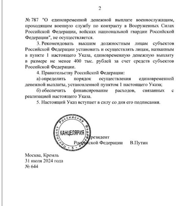 Президент России Владимир Путин подписал указ о федеральной выплате 400 тыс. рублей военным, которые с 1 августа и до конца года заключат контракт для службы в зоне СВО. Документ размещен на официальном сайте Кремля.