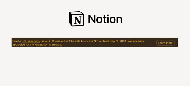 С 9 сентября 2024 года пользователи cервиса для создания и редактирования заметок и баз данных Notion, находящиеся в России, потеряют доступ к платформе. Это связано с введенными правительством США санкциями, которые запрещают доступ к определенным программным продуктам и услугам для россиян