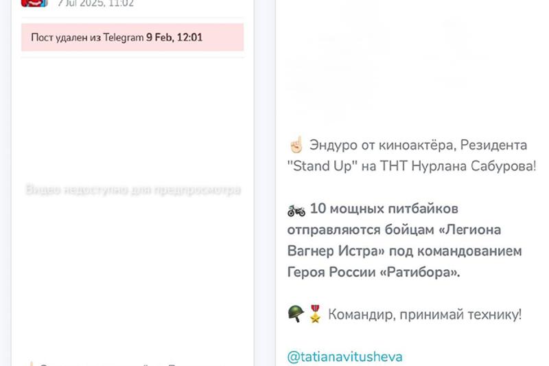 Поводом к этому заявлению стал пост в telegram-канале главы города Истра Татьяны Викушевой, опубликованный еще летом. В нем говорилось о помощи Нурлана Сабурова, который проживал как раз в Истринском районе, в передаче 10 питбайков бойцам «Легиона Вагнер Истра». Но 9 февраля канал почистили, удалив этот пост.