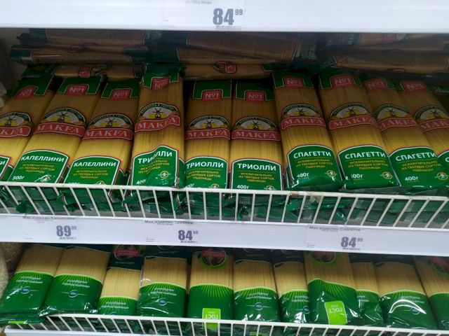 Цены на макароны остались на прежнем уровне. За упаковку в 400 г нужно отдать 84-89 рублей. Есть макароны и по акции, но если месяц назад со скидкой их можно было взять за 44 рубля, то сейчас их цена даже по акции составит около 50 рублей.