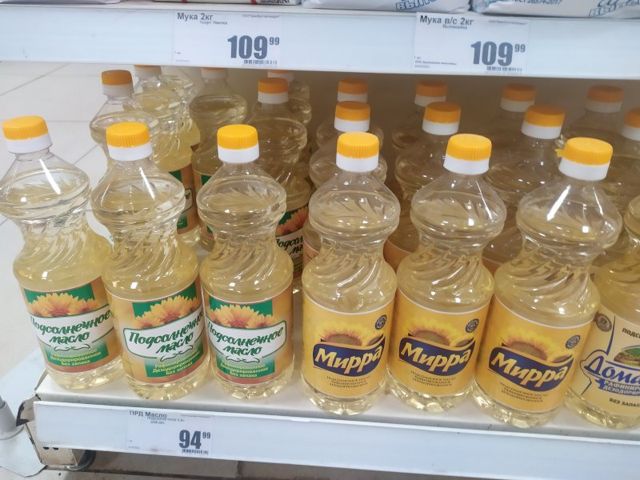 Изменились цены на подсолнечное масло. Долгое время они были заморожены, минимальная цена держалась на уровне 90-100 рублей/л. Спустя месяц литровая бутылка по акции стоит от 102 рублей, в среднем цена составляет около 120 рублей/л.