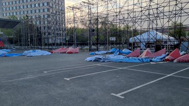 В это же время на площади репетировали творческие коллективы. Участники театрализованного представления ушли, как только усилился ветер.