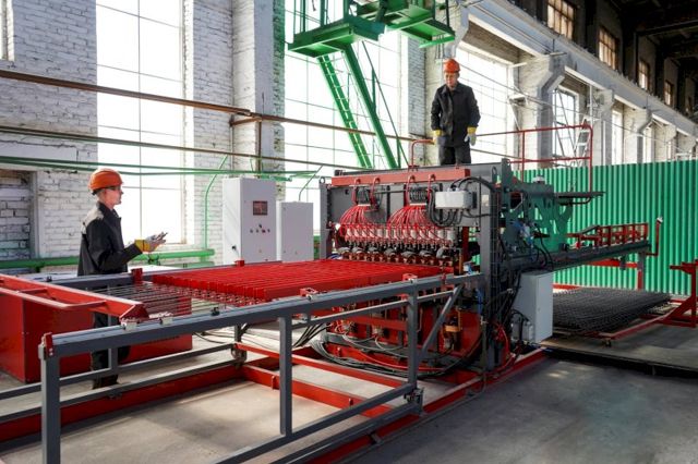 «Принцип работы станка следующий: продольные трехметровые мерные прутки укладываются в направляющие модуля и подаются в узел сварки. Через определенный временной интервал из верхнего бункера подаются поперечные прутки. В месте соединения прутков, называемом сварочный портал, происходит их автоматическая контактная сварка: 13 электродов одновременно сваривают места пересечения продольных и поперечных прутков», – рассказал главный инженер ремонтно-механического завода Константин Абрамов.