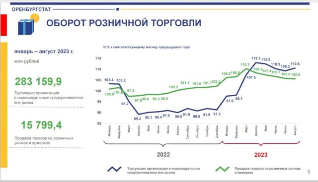 «Населению в январе - августе 2023 года продано пищевых продуктов, включая напитки, и табачных изделий на 145676,2 млн рублей, непродовольственных товаров – на 153283,1 млн рублей, что в товарной массе составило к уровню января - августа 2022 года 107% и 108%», - отметили в Оренстате.