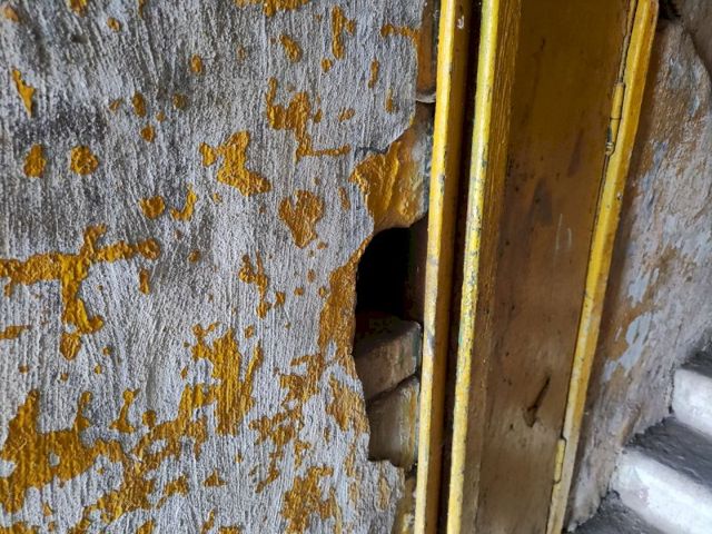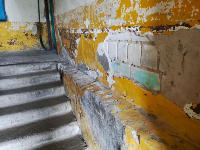 Изнутри подъезды выглядят не лучше - из стен выпадают кирпичи, видны дыры размером с голову. Штукатурка отваливается, от потолка спускаются трещины.