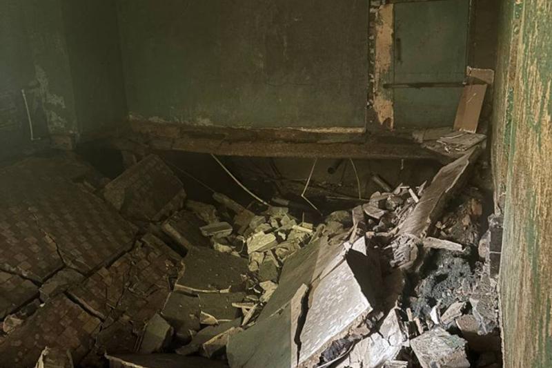 В комнате на первом этаже, где находится душевая, произошло обрушение пола и разрушение смежных перегородок. По предварительным данным, причиной этого стало ненадлежащее использование здания в течение длительного времени.