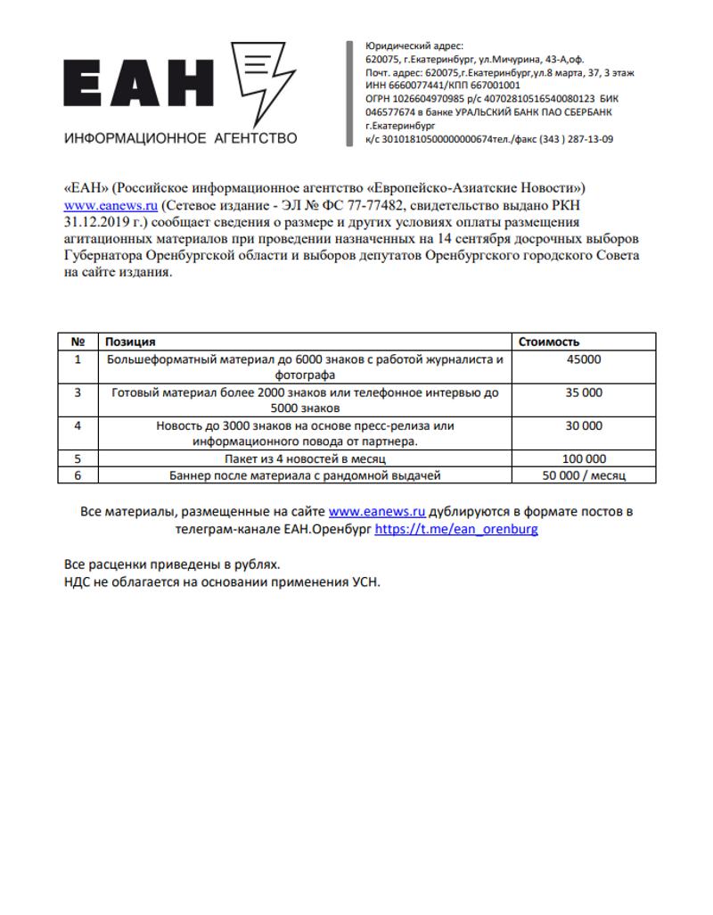РИА «Европейско-Азиатские Новости» является старейшим информационным агентством Среднего Урала. Первое свидетельство о СМИ ЕАН получил еще в 1993 году, а доменное имя в интернете зарегистрировал в 2005-м. Сегодня количество уникальных читателей в месяц составляет 1,2 млн человек, а в сутки – 50 тыс. В день мы публикуем более 60 материалов, в том числе новости, интервью, фото- и видеорепортажи, аналитические статьи и обзоры. Предлагаем вам сотрудничество в рамках новой предвыборной кампании в Оренбургской области.