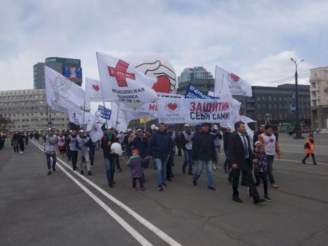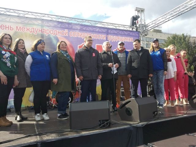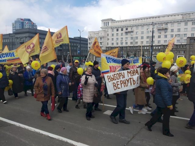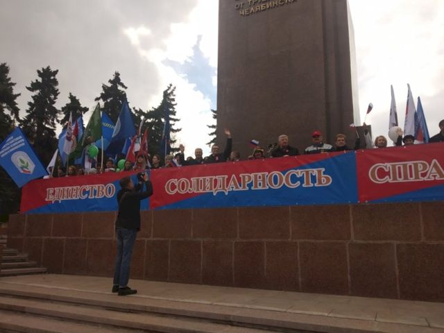 Затем, пообщавшись с прессой, Текслер, Мякуш, Буяков, Елистратов и еще несколько VIP-персон встали во главе профсоюзной колонны, и кружным путем, через улицы Елькина и Воровского, отправились шествием на площадь Революции. При входе на площадь профсоюзы встретились с еще одной колонной, объединявшей «Единую Россию» и ее «Молодую гвардию», движение «За возрождение Урала» и еще ряд организаций.