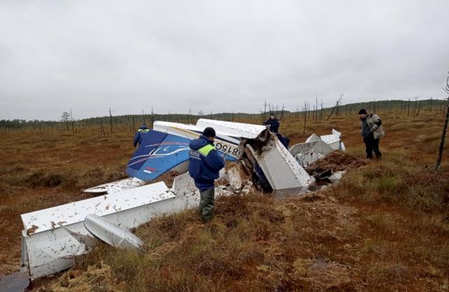 По предварительной информации, на борту находились два человека. Самолет упал в заболоченную местность - носовая часть фюзеляжа утоплена.