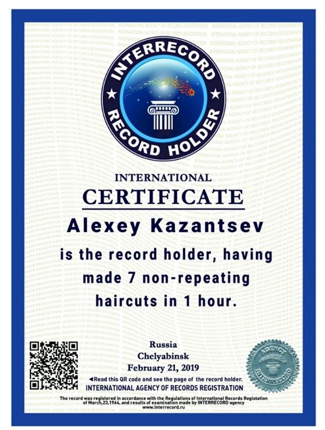 В ближайшее время рекордсмен получит официальный сертификат. Ранее 38-летний барбер достиг еще двух вершин. Он сделал 70 разных стрижек за час и побил рекорд России по окрашиваниям: 7 окрашиваний разной сложности всего за 6 часов.