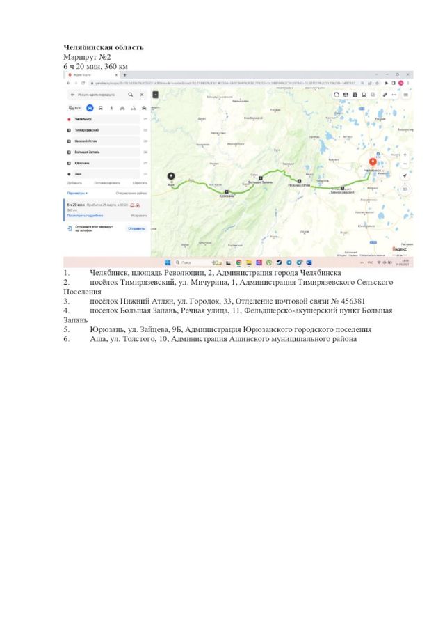 Второй маршрут – 360 км. Из Челябинска в Тимирязевский, Нижний Атлян, Большая Запань, Юрюзань и Аша.