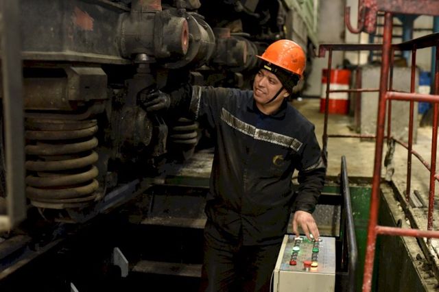 «У колесных пар локомотивов со временем изнашивается бандаж – элемент колес, который контактирует с рельсами. Когда он достигает критической отметки износа, колесные пары заменяются на новые: с помощью скатоподъемника с локомотива снимается колесно-моторный блок, а после замены колес устанавливается обратно», – пояснил главный инженер железнодорожного цеха Андрей Атаманов.