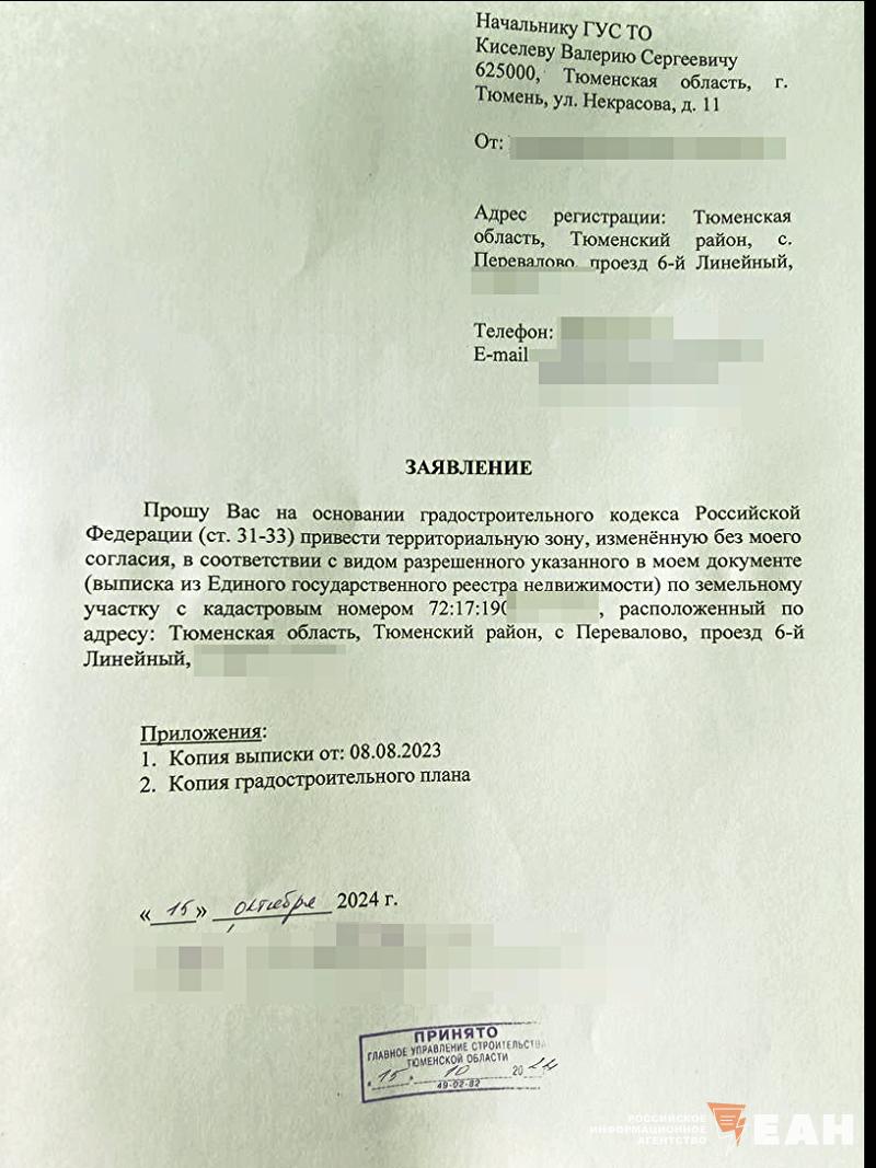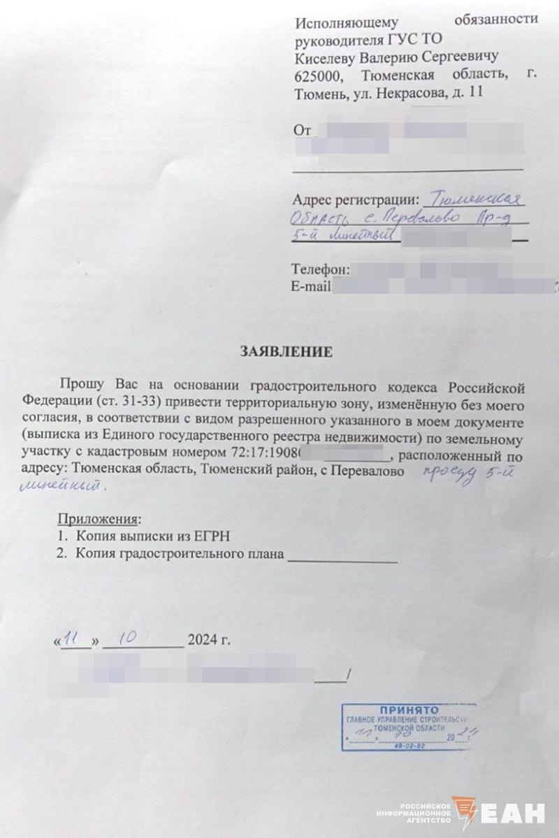 В Главное управление строительства Тюменской области жители «домов Борисова» из Перевалово массово несут заявления с требованием вернуть им их ИЖС, т.к. именно на ИЖС у них есть все законно оформленные документы. В распоряжение редакции ЕАН граждане передали несколько типичных заявлений.