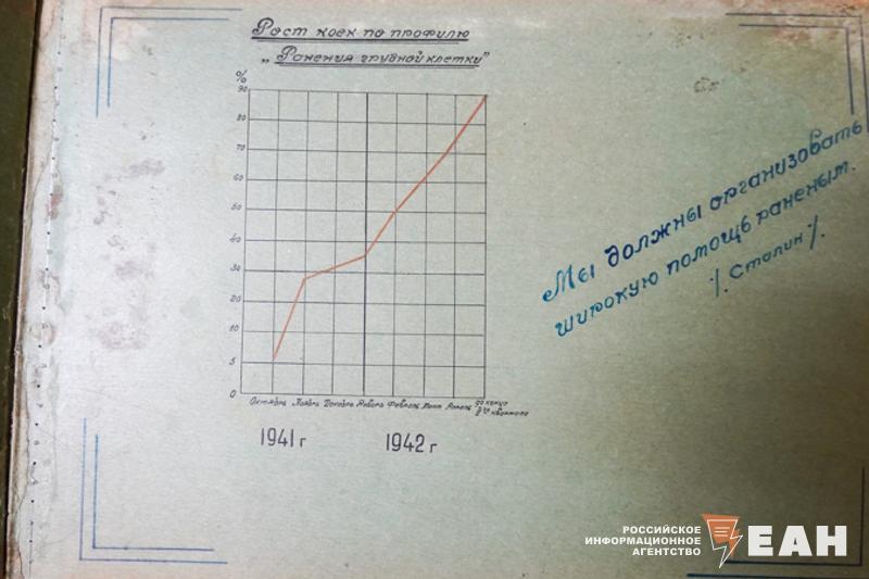 Директор музея госпиталя ветеранов войн Нина Иванова рассказала, что профилем лечебного учреждения были ранения в грудную клетку и конечности. Она показала старшейший экспонат, который чудом сохранился до нашего времени. Это альбом «Ранения грудной клетки 1941-1942 год». На его страницах большая часть истории госпиталя.
