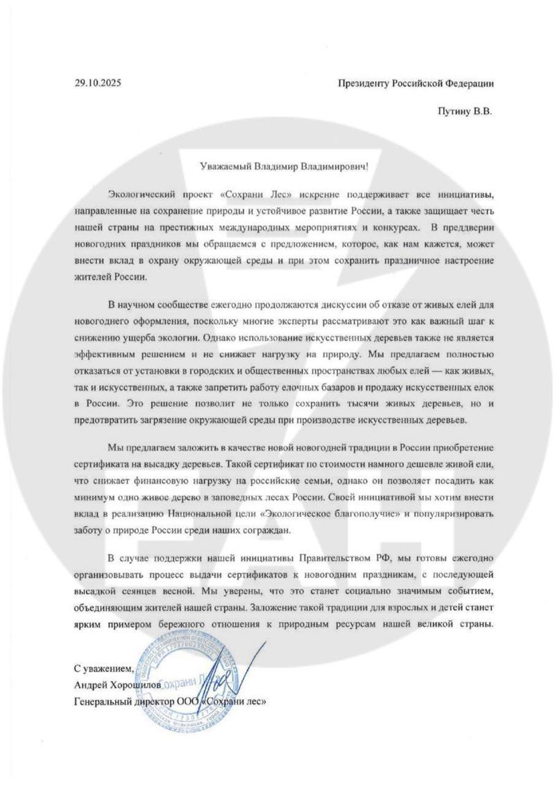 «Мы предлагаем заложить в качестве новой новогодней традиции в России приобретение сертификата на высадку деревьев. Такой сертификат по стоимости намного дешевле живой ели, что снижает финансовую нагрузку на российские семьи, однако он позволяет посадить как минимум одно живое дерево в заповедных лесах России», - написал президенту Андрей Хорошилов.