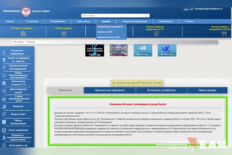 Однако после ареста Жуковского Киселев, пришедший к власти в «Омскэлектро», совершил, похоже, очень необычный поступок. Результатом стало объявление на главной странице «Омскэлектро», висящее там и во второй половине апреля 2026 года: «Доводим до вашего сведения, что с 01.11.2025 АО "Омскэлектро» расторгло договоры аренды и предоставления права размещения подвесов ВОЛС с ООО «Энергоактивуправление». Просим в кратчайшие сроки обратиться в АО «Омскэлектро» с заявкой на заключение договора размещения подвесов ВОЛС на опорах ЛЭП 10/0,4 кВ, а также опорах наружного освещения, принадлежащих АО «Омскэлектро". В случае непредоставления заявки АО " Омскэлектро» оставляет за собой право произвести демонтаж незаконно размещенного оборудования связи…»