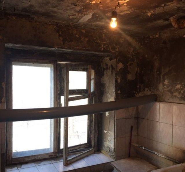 Состояние кирпичного строения повергает в ужас: стены облупились и покрылись плесенью, в общей ванной давно не осталось даже следа от штукатурки, а в подвале течет вода. Дом построен в 1968 году, сейчас в нем проживают 165 семей.