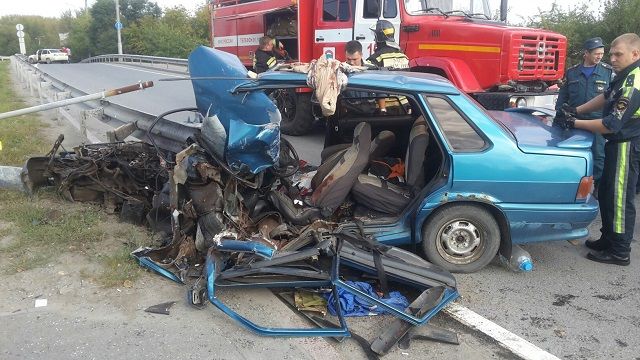 Пьяный водитель за рулем ВАЗ-2115 врезался в отбойник на большой скорости на мосту по улице Пермякова в Тюмени.