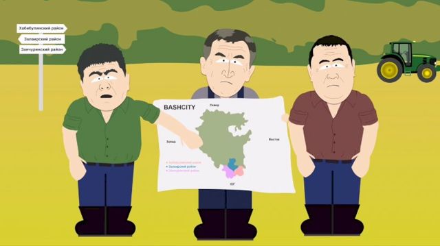 В мультике также появляются руководители настоящего географического юга республики – Хабибулинского (Хайбуллинского), Залаирского (Зилаирского) и Занчуринского (Зианчуринского) районов: «Юг Bashcity – это же мы! А нас даже не позвали».