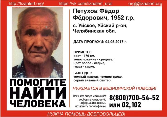 С 4 мая мужчину никто не видел. Приметы: рост 170 см, среднее телосложение, седые волосы, карие глаза. Был одет в темный пиджак, темное трико и серый вязаный свитер.