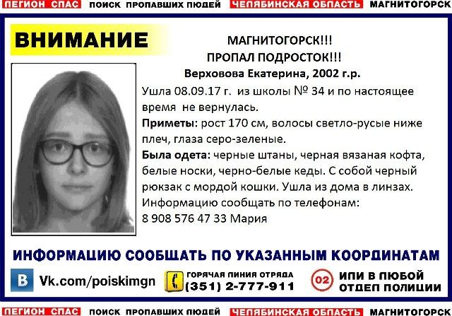 В Магнитогорске разыскивают 15-летнюю школьницу. Екатерина Верховова 8 сентября ушла из школы № 34 и не вернулась, сообщается на странице поискового отряда «Легион спас».