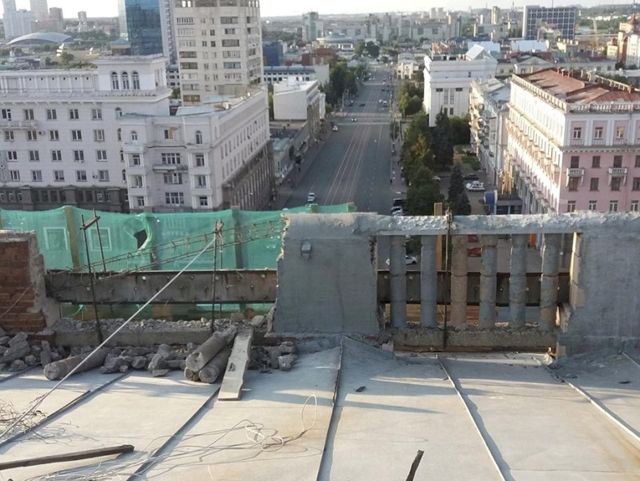 В Челябинске на этой неделе начался капитальный ремонт здания на Площади революции, 1. В социальных сетях возмущенные горожане обсуждают, что рабочие сносят парапет с колоннадой.