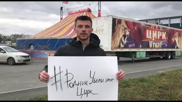На видео мужчина с плакатом #РодникУбериэтотЦирк перечисляет три причины, почему не следует посещать цирк с животными.