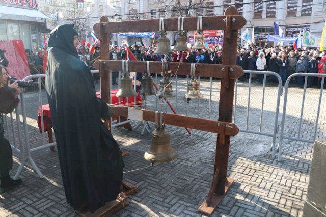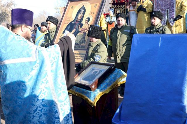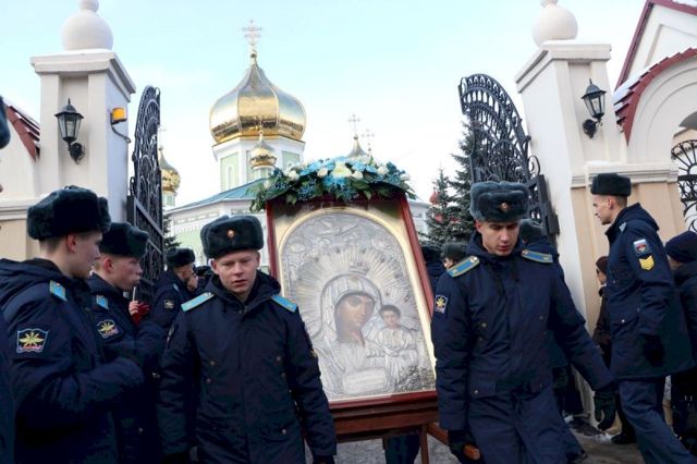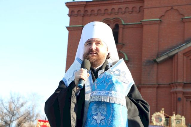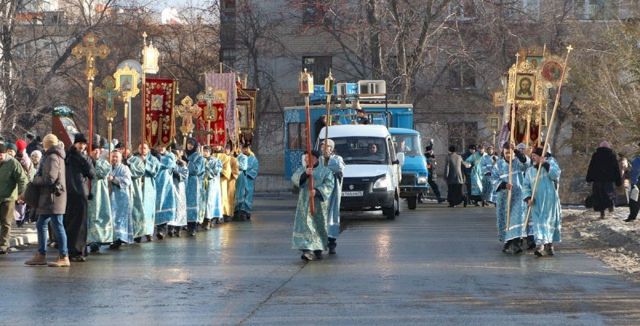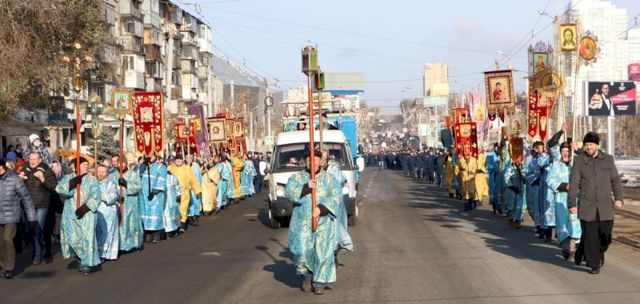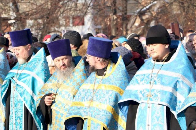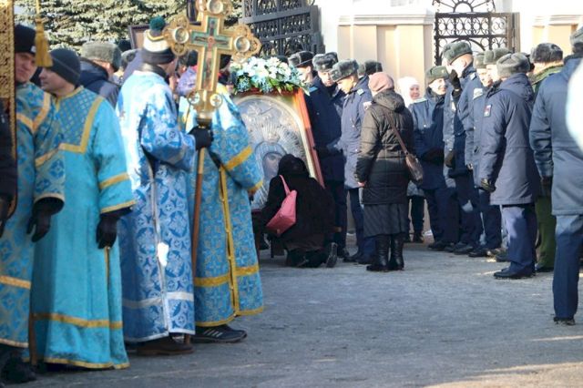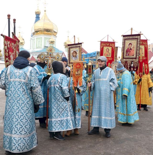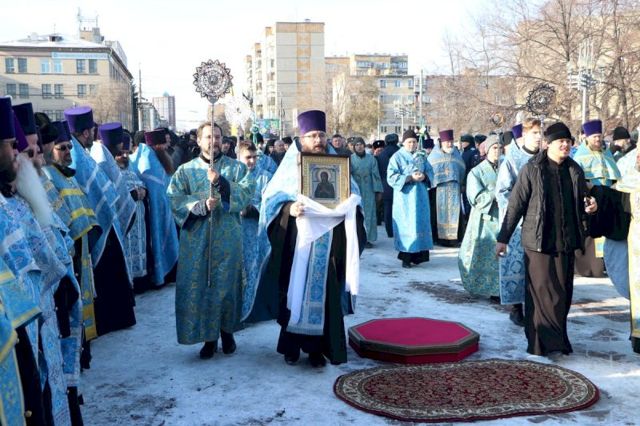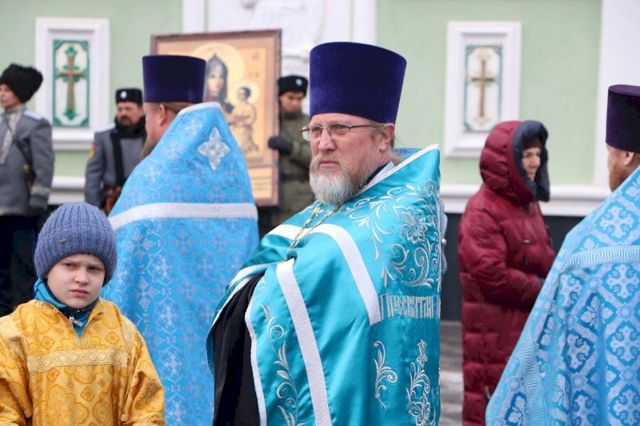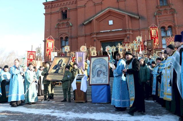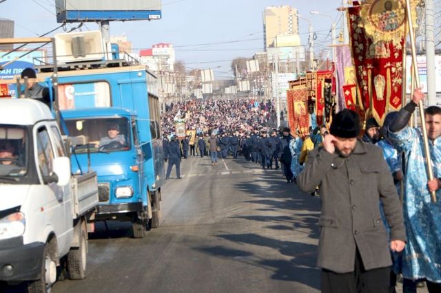 Впереди колонны верующих следовал старинный, более чем столетней давности список иконы Божией Матери Казанской, хранящейся в кафедральном соборе, и мироточивый образ Богородицы «Умягчение злых сердец», доставленный из подмосковного села Бачурино.