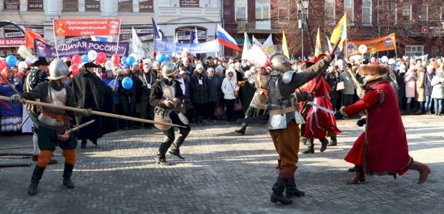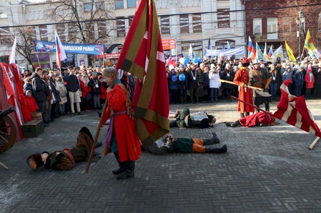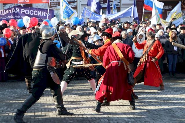 Вскоре после крестного хода на Кировке началась костюмированная реконструкция событий 1612 года. Реконструкторы изобразили сражение народного ополчения и войск польского короля Сигизмунда Третьего.
