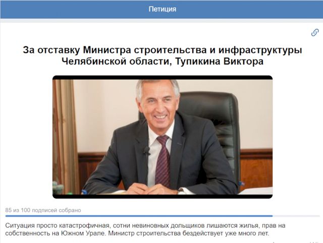 Петицию создали 20 января в социальной сети «ВКонтакте». Ссылку на обращение опубликовали в группе «Обманутые дольщики | Челябинск». Люди начали ею делиться с просьбой подписать и распространить. Всего свои подписи под требованием уволить министра строительства Виктора Тупикина оставили 84 человека.