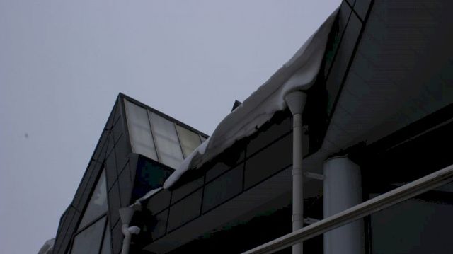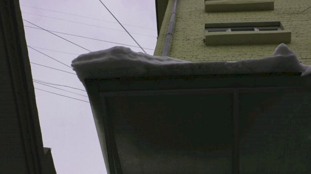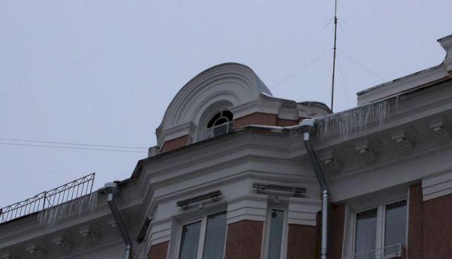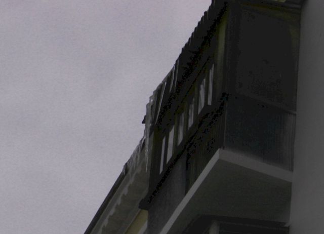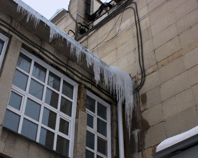 Недавно выпавший снег под воздействием температур начал подтаивать и скатываться к карнизу. Ночью эта кашица подмерзает, а утром, вновь подтопившись, падает на головы прохожим, которые ничего не подозревают, ведь снизу эти накаты практически не видно.