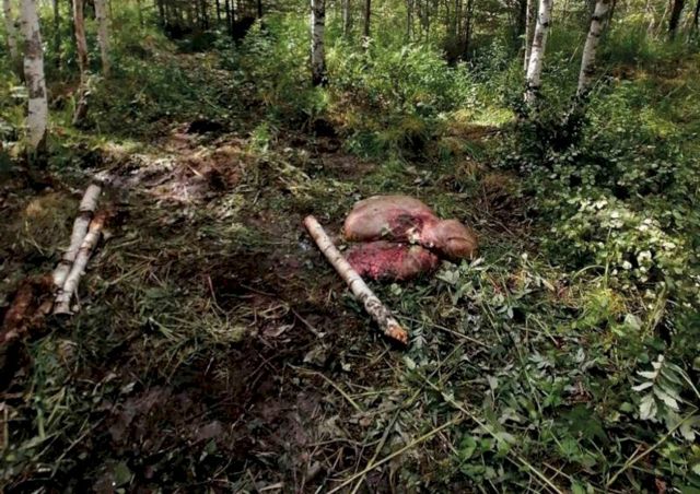 Колея от автомобиля УАЗ привела сотрудников нацпарка «Зигальга» к месту, где произошло преступление. Свою добычу браконьеры разделали и вывезли – в машину, которая осталась в 700 м, груз носили на руках. Шкуры попытались спрятать.