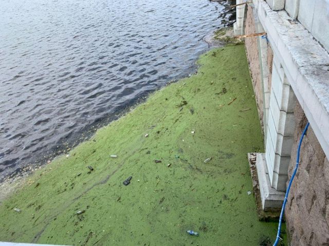 Техника действительно собирает ряску и мусор на реке у моста по улице Кирова.