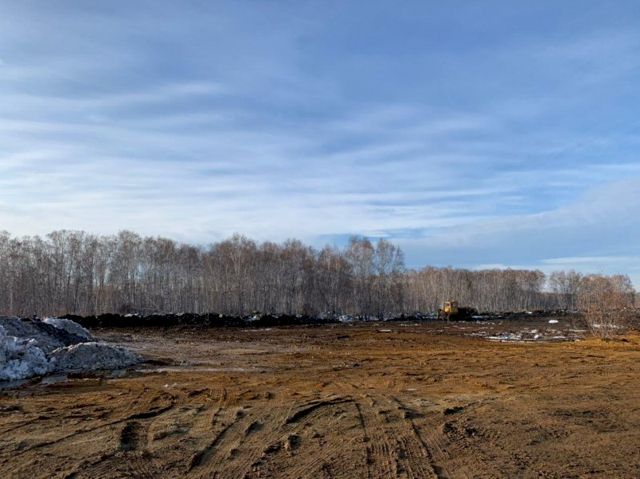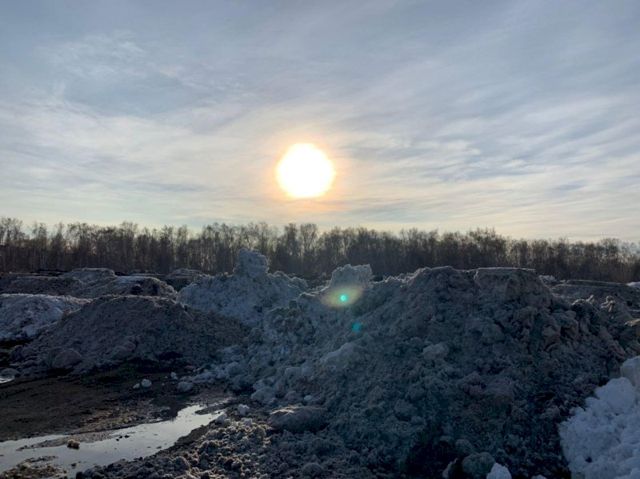 На участке видны земляные бугры — обваловка. Рабочий, который дежурит на объекте и принимает грузовики со снегом, объясняет, что территория разделена на несколько частей: две из них уже полностью готовы к работе, а третьей сейчас занимается экскаватор — равняет поверхность, делает обваловку высотой около 1,5-2 м.