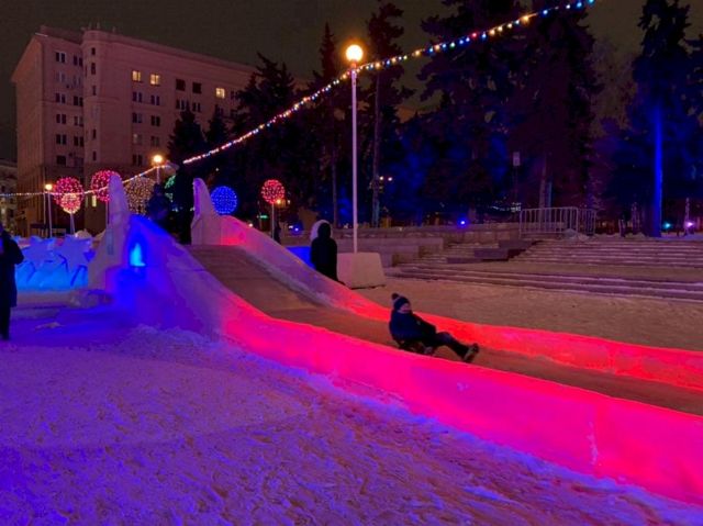 Журналисты заметили, что сегодня, к моменту открытия ледового городка на площади Революции горки оказались не почищены, дети скатывались с них с трудом. На улице в течение дня шел снег.