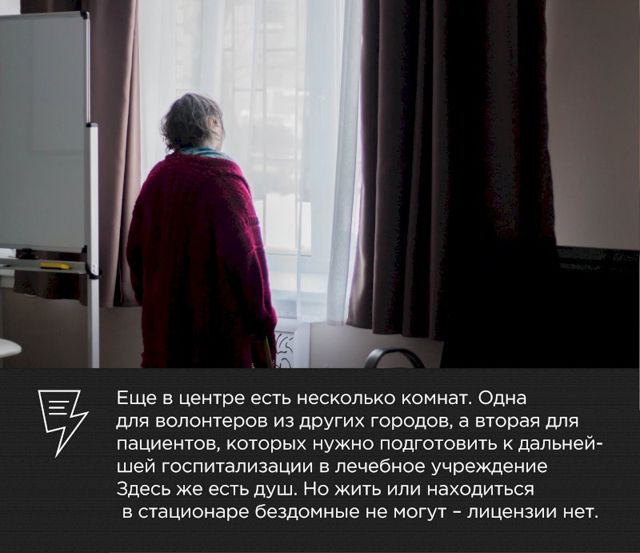 Строгая соцработница Евгения формирует каждому индивидуальный пакет – она помнит, что выдавала в прошлый раз: этому печенье, трусы, носки и мыло, а этому – зубную щетку, туалетную бумагу и бритву: «Я тебе кофту теплую в прошлый раз давала – почему не в ней? Носи давай! Холод такой!» Никита выдает мази, витамины, таблетки. Доктор Женя в это время консультирует бездомных о травмах, рассказывает, когда нужно прийти в центр на осмотр.