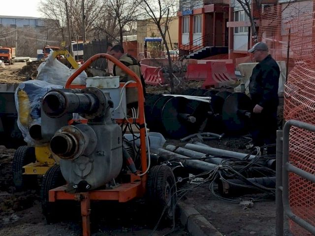 В Челябинске продолжают ликвидировать последствия провала грунта. Из коллектора откачивают воду, устанавливают временный коллектор, осушают основной.
