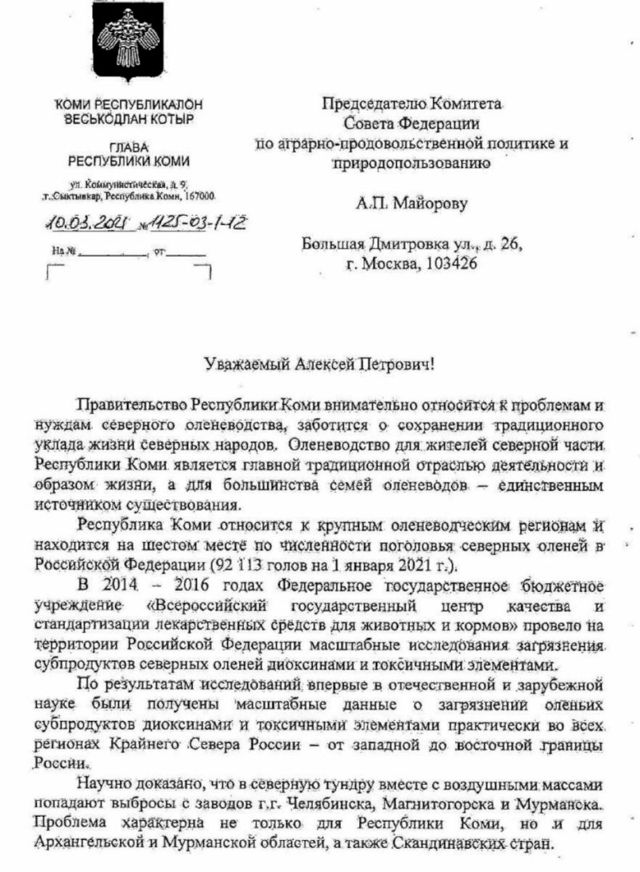 «В целях обеспечения продовольственной безопасности, выработки дополнительных мероприятий по охране оленьих пастбищ на территории арктических регионов РФ, принимая во внимание важность вопроса для дальнейшего развития северного оленеводства, производственного экологического контроля предприятий топливно-энергетического сектора с уполномоченными органами, ответственными за охрану окружающей среды», – говорится в письме Владимира Уйбы.