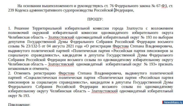 Кандидат в депутаты Госдумы РФ по Златоустовскому избирательному округу № 193 Сергей Гаврюшкин от партии «Родина» через суд пытается снять с выборов троих конкурентов действующего депутата Госдумы РФ Олега Колесникова от «Единой России», Павла Логинова от «Справедливой России» и Степана Фирстова от «Партии пенсионеров». Гаврюшкин подал три иска в Челябинский областной суд.