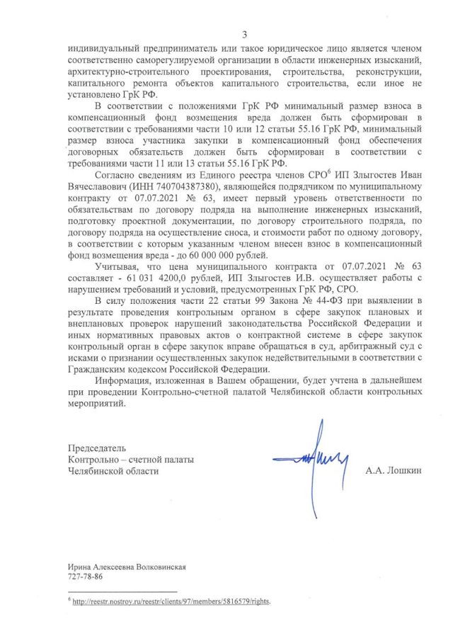 «Согласно сведениям из Единого реестра членов СРО, ИП Иван Злыгостев, являющийся подрядчиком, имеет первый уровень ответственности по обязательствам по договору подряда на выполнение инженерных изысканий, подготовку проектной документации, по договору строительного подряда и стоимости работ по одному договору – до 60 млн рублей. Учитывая, что цена муниципального контракта 61 031 420 рублей, ИП Ивана Злыгостева осуществляет работы с нарушением требований и условий, предусмотренных Градостроительным кодексом РФ», - говорится в ответе КСП.