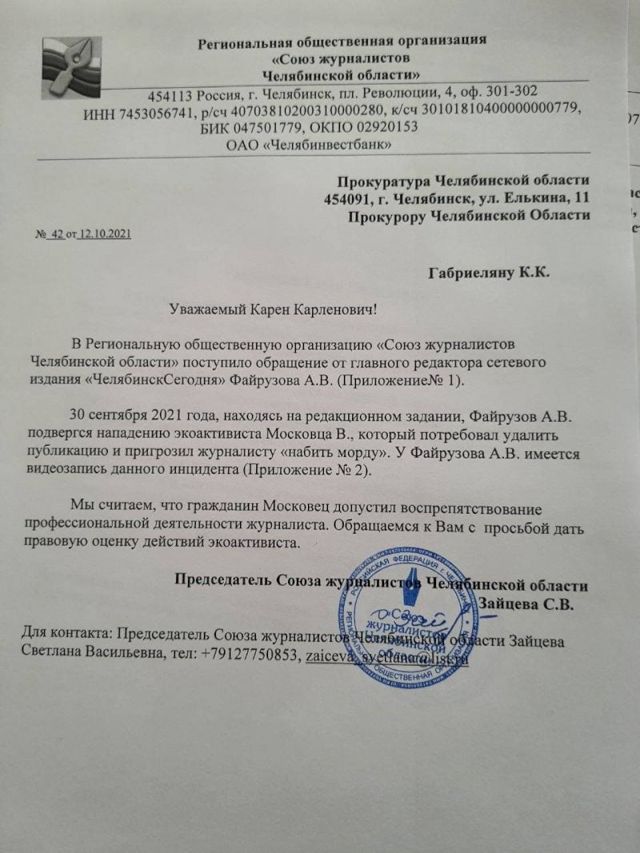 «Союз журналистов расценивает данный инцидент как прямое воспрепятствование профессиональной деятельности журналиста и обращается в правоохранительные органы Челябинской области с просьбой дать правовую оценку действий экоактивиста Василия Московца», - сообщили в СЖР ЧО.