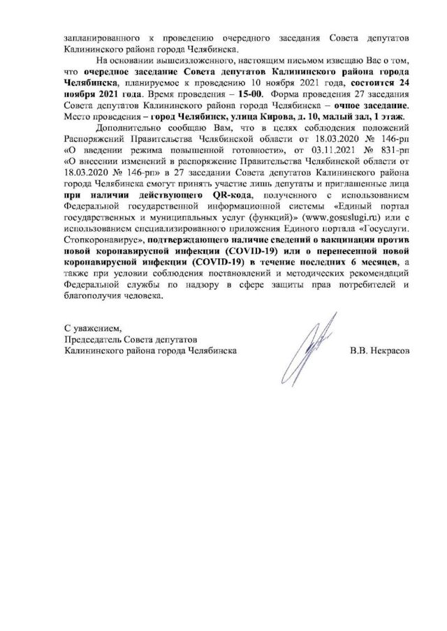 «В 27-м заседании совета депутатов Калининского района смогут принять участие лишь депутаты и приглашенные лица при наличии действующего QR-кода, подтверждающего наличие сведений о вакцинации против новой коронавирусной инфекции (COVID-19) или о перенесенной инфекции в течение последних 6 месяцев, а также при условии соблюдения постановлений в сфере защиты прав потребителей и благополучия человека», - говорится в письме за подписью председателя совета Вячеслава Некрасова.