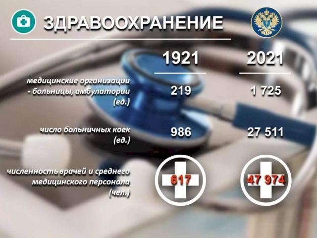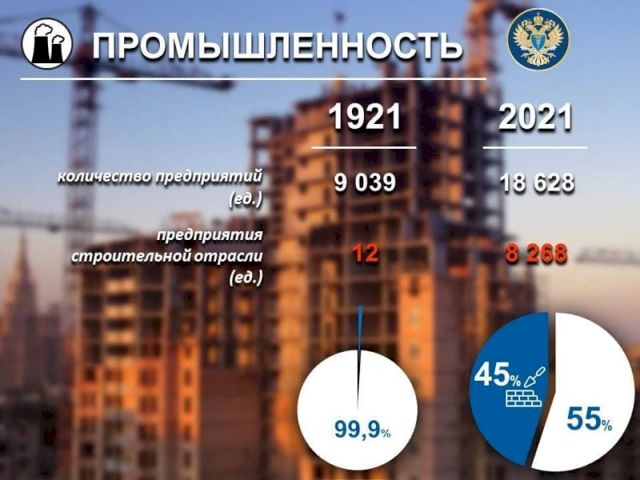 Количество промышленных предприятий выросло с 9 тыс. в два раза, строительных компаний – с 12 до 8,3 тыс. Число медицинских организаций за 100 лет увеличилось с 219 до 1 725, а работников сферы здравоохранения – с 617 до почти 48 тыс. человек.