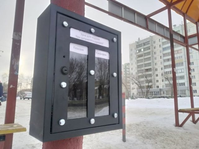 Металлический ящик разделен на два отсека, с лицевой стороны имеет прозрачную стенку. Вверху закреплен лист бумаги с надписью: «Чем заправлять окрошку?» - и двумя вариантами ответов: слева раздел «квасом», справа – «кефиром». По количеству окурков в дальнейшем будет видно, какой напиток более популярен среди курящих горожан.