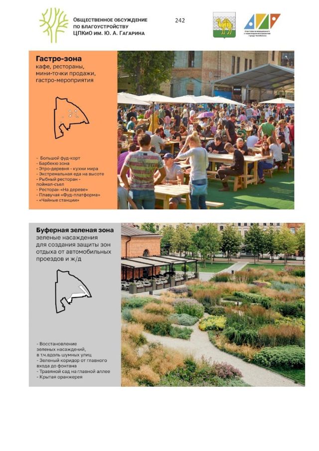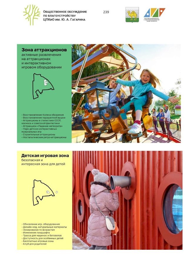 1. Гостевая зона – зона входов в парк. Необходима организация безбарьерных пешеходных путей, приподнятых безопасных пешеходных переходов; освещение входных групп и прилегающей территории; упорядоченные парковки, без пересечения с пешеходными путями, без добавления дополнительных парковочных мест с учетом доступности для МГН; регулирование количества автомобилей при помощи ограничения времени парковки. 2. Зона аттракционов – зона активных развлечений на аттракционах и интерактивном игровом оборудовании для получения ярких и острых эмоций. Обязательно благоустройство территории, сооружение навесов от солнца и дождя, всесезонных кафе и туалетов. Возможность быстрой безналичной оплаты, без создания очередей, гибкая тарифная сетка.