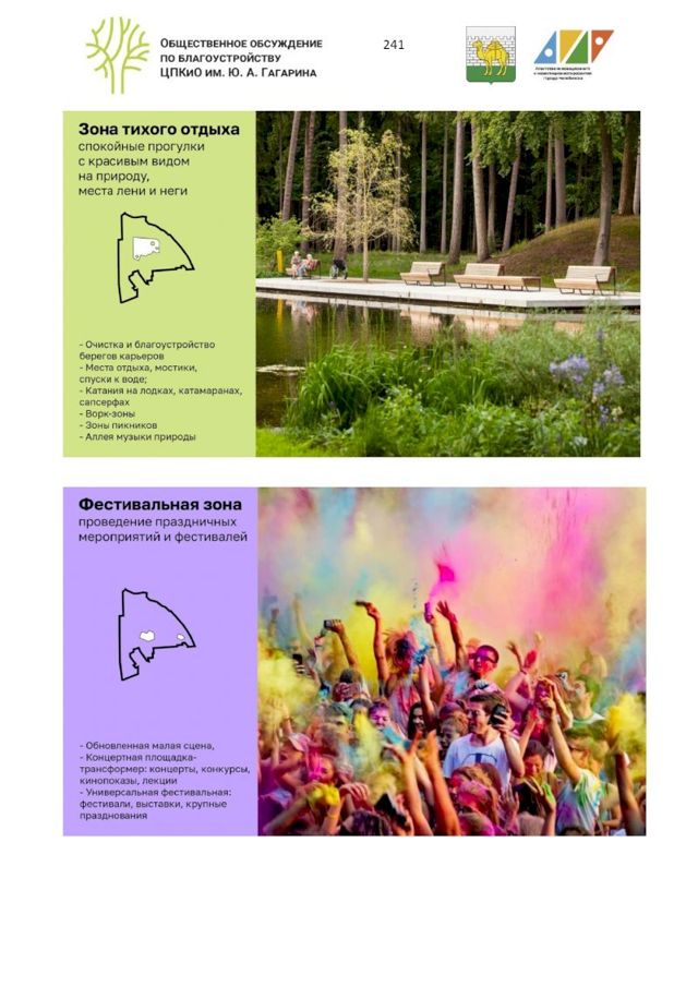 4. Зона познания – зона, частично размещенная в лесной части парка, с объектами, гармонично вписанными в ландшафт. Обязательна очистка акватории карьеров от прибрежных кустов и ила; санитарная обрезка и возобновление зеленых насаждений; благоустройство и освещение территории.