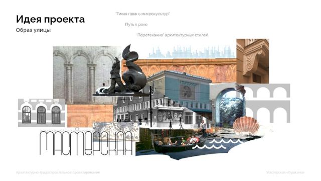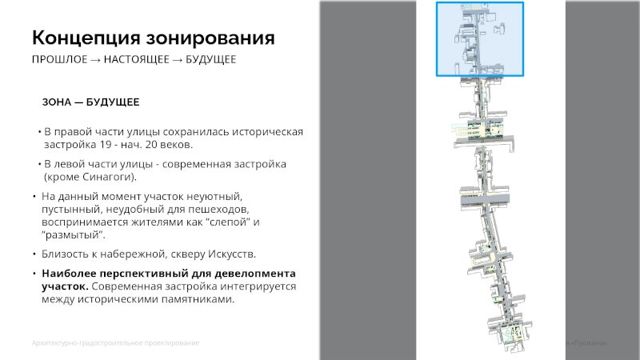 Концепт «воды» проектировщики постарались воплотить во всем, начиная от дизайн кода (по мнению горожан он крайне важен для этой улицы), заканчивая каждым столбиком, фонарем, скамейкой и озеленением - каждую деталь. Заметим, что ребята разделили улицу на три условные части: прошлое, настоящее и будущее и для всех предусмотрели модели развития.