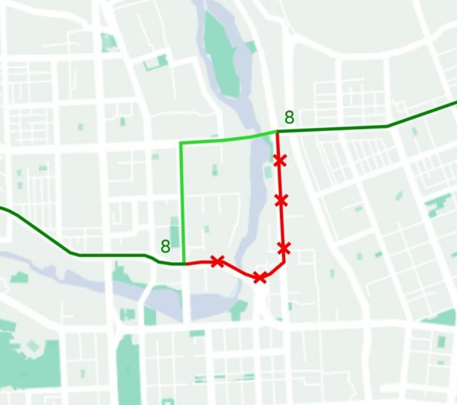 Маршрут № 8 будет следовать с улицы Мамина по проспекту Победы, улицам Кирова, Братьев Кашириных и до Академика Королева, девятый – с Мамина на Победы, поворачивать на Свердловский проспект, оттуда – на Комсомольский и до улицы Петра Столыпина. Маршрут № 34 будет выглядеть так: Мехколонна – пр. Победы – Свердловский пр. – Комсомольский пр. – Автобусный парк, № 45 – Аэропорт – пр. Победы – Свердловский пр. – Комсомольский пр. – Автобусный парк. От ДК Строителей маршрут № 25с пойдет по Свердловскому проспекту на Победы и до Ферросада.