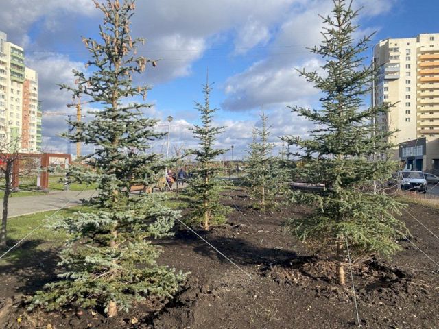 В сквере на Академика Королева в Челябинске высадили 117 крупномерных саженцев сосны горной, яблони сибирской и ели колючей (голубой). Помимо деревьев здесь добавили кустарники: 215 дерена белого и 4,1 тыс. кизильника.